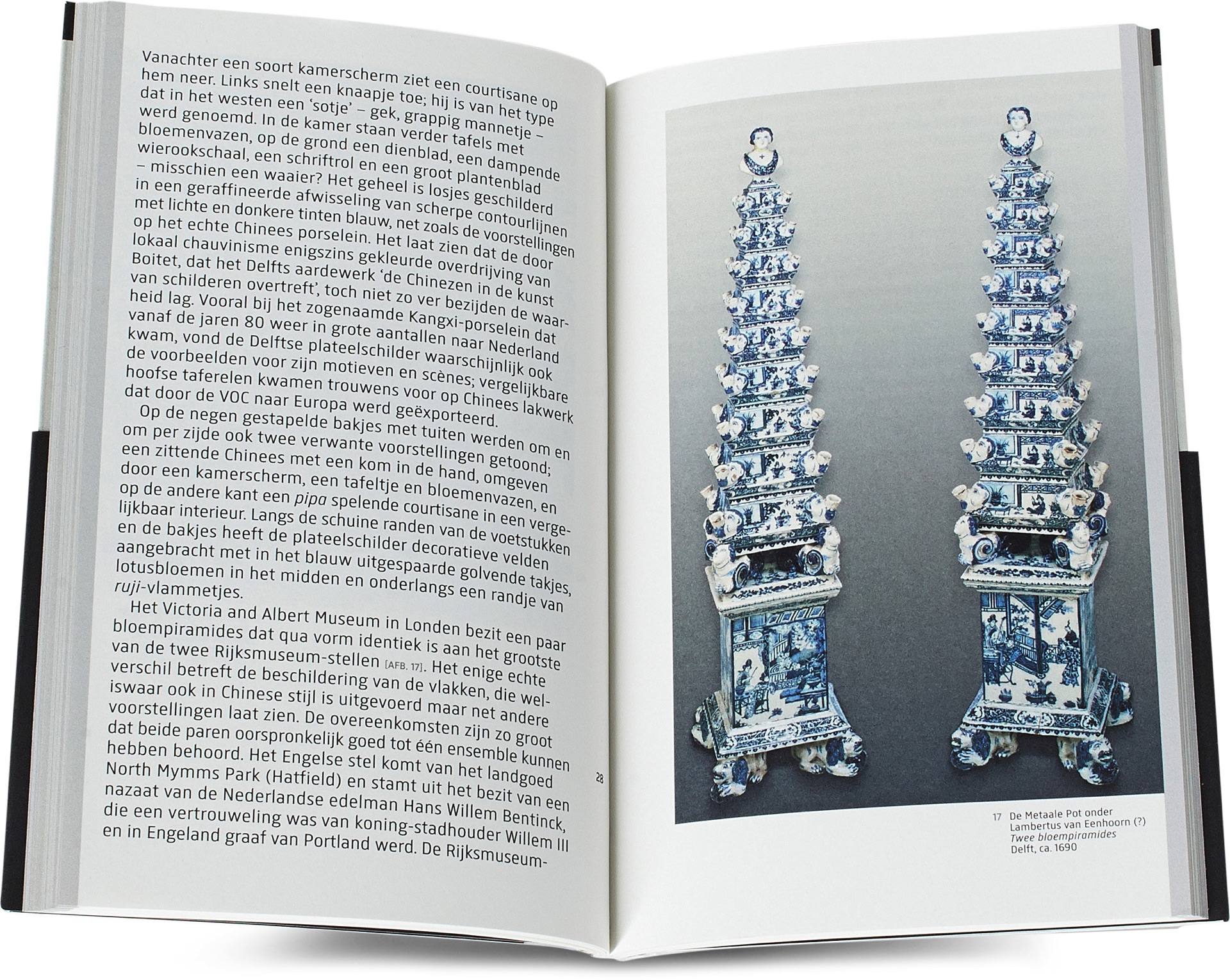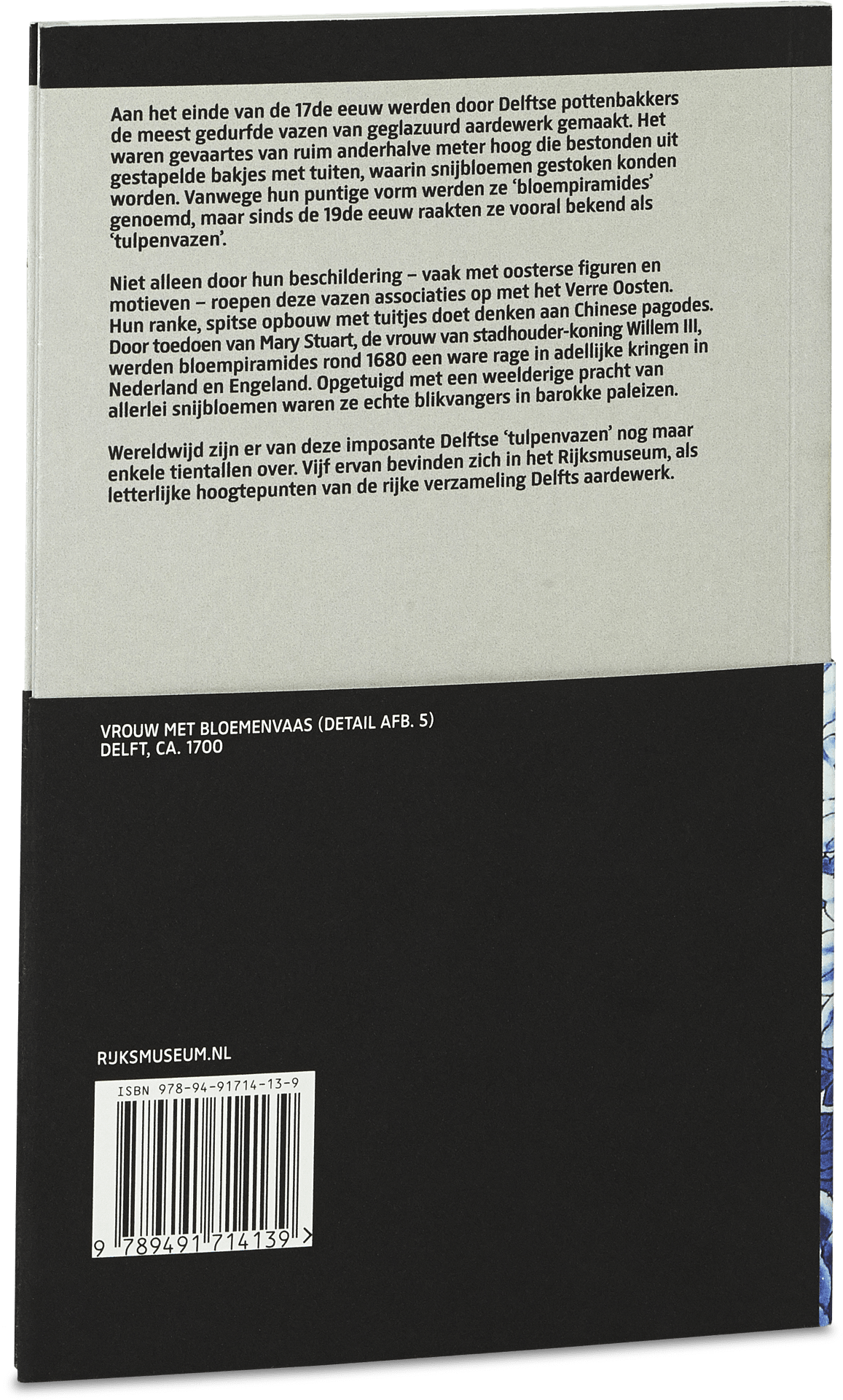 Aan het einde van de 17de eeuw werden door Delftse pottenbakkers de meest gedurfde vazen van geglazuurd aardewerk gemaakt. Het waren gevaartes van ruim anderhalve meter hoog die bestonden uit gestapelde bakjes met tuiten, waarin snijbloemen gestoken konden worden. Vanwege hun puntige vorm werden ze ‘bloempiramides’ genoemd, maar sinds de 19de eeuw raakten ze vooral bekend als ‘tulpenvazen’. Niet alleen door hun beschildering − vaak met oosterse figuren en motieven − roepen deze vazen associaties op met het Verre Oosten. Hun ranke, spitse opbouw met tuitjes doet denken aan Chinese pagodes. Door toedoen van Mary Stuart, de vrouw van stadhouder-koning Willem III, werden bloempiramides rond 1680 een ware rage in adellijke kringen in Nederland en Engeland. Opgetuigd met een weelderige pracht van allerlei snijbloemen waren ze echte blikvangers in barokke paleizen. Wereldwijd zijn er van deze imposante Delftse ‘tulpenvazen’ nog maar enkele tientallen over. Vijf ervan bevinden zich in het Rijksmuseum, als letterlijke hoogtepunten van de rijke verzameling Delfts aardewerk. In deze editie in de Rijksmuseum Reeks beschrijft Frits Scholten de bloei van het Delfts Blauw in de 17de eeuw.