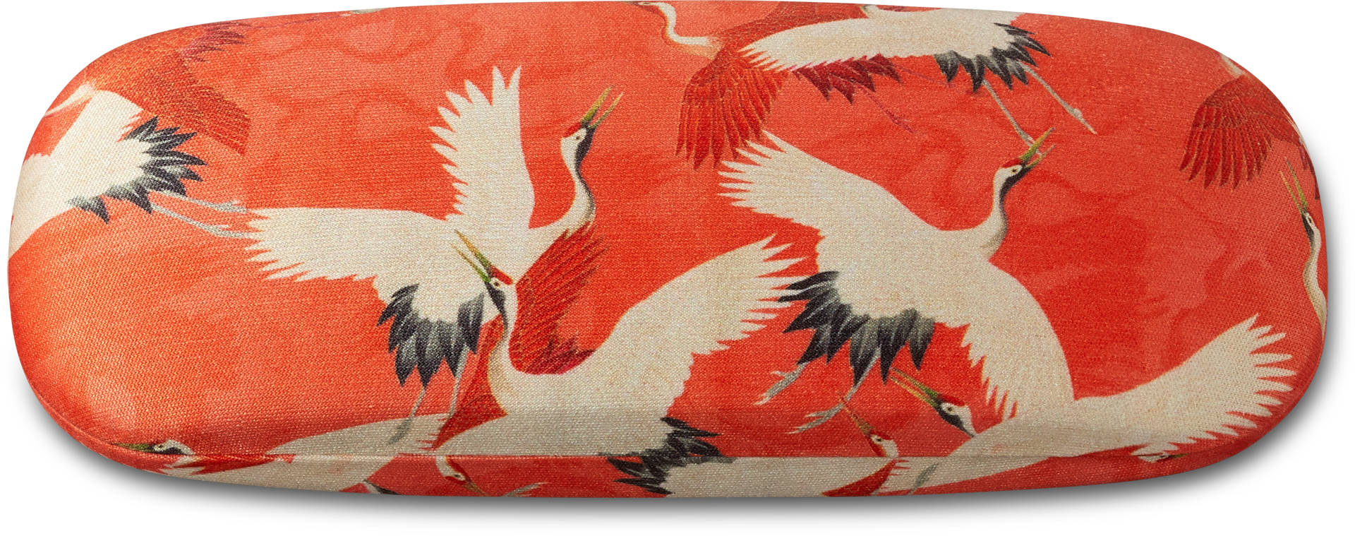 Een prachtige brillenkoker bekleed met stof. De opdruk komt van een kimono met kraanvogels uit de collectie van het museum.