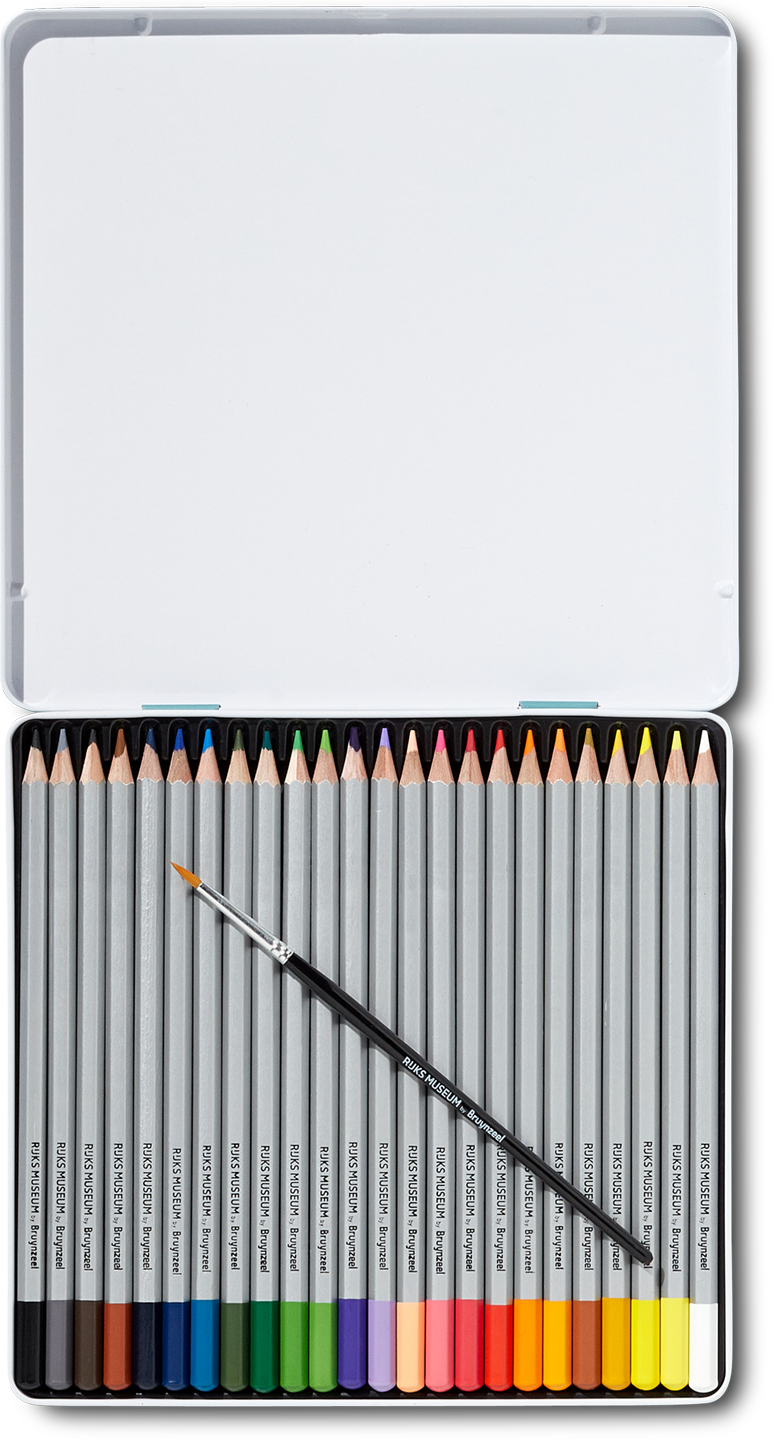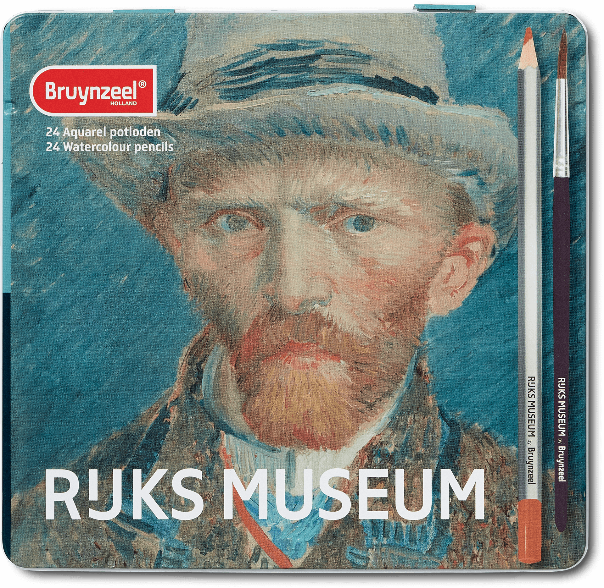 A set of 24 watercolour pencils in various colours and a brush, packaged in a metal tin featuring a detail from Vincent van Gogh's famous Self-Portrait. Made from high-quality pigments. Extra durable pencils that are easy to sharpen.