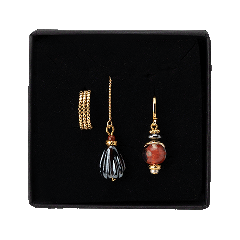 Add a festive touch to your look with this set of three coordinating earrings. Each piece is crafted from hypoallergenic metal, plated with 16-carat gold. For a playful and unique style, choose the thread earring in one ear and a combination of the pendant and the ear cuff in the other. This “Earparty” set is a joy to give and even more delightful to receive. The design is inspired by The Night Watch by Rembrandt van Rijn.