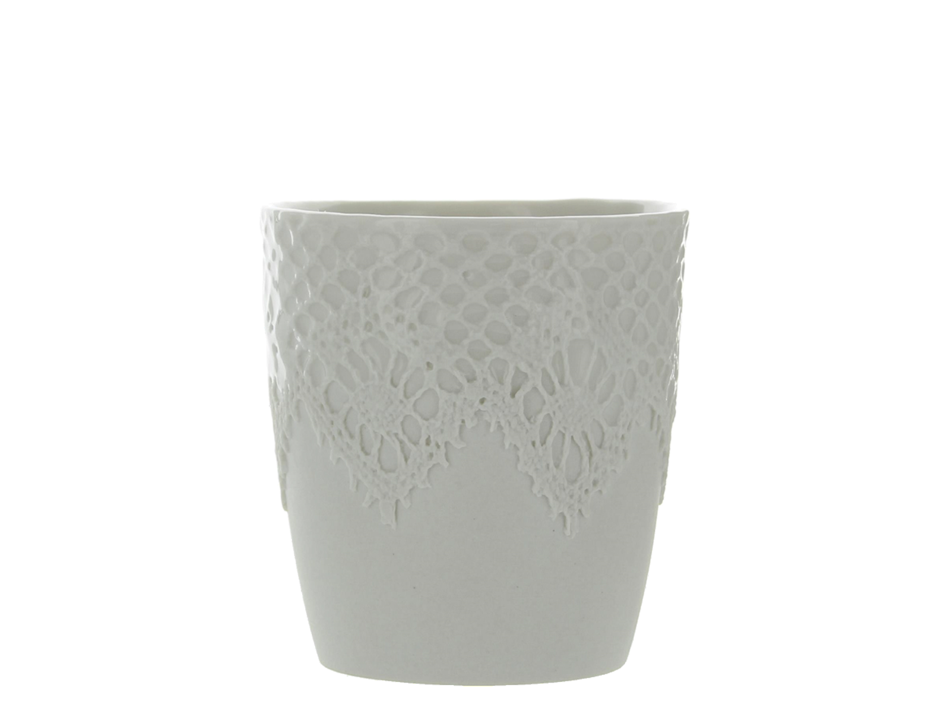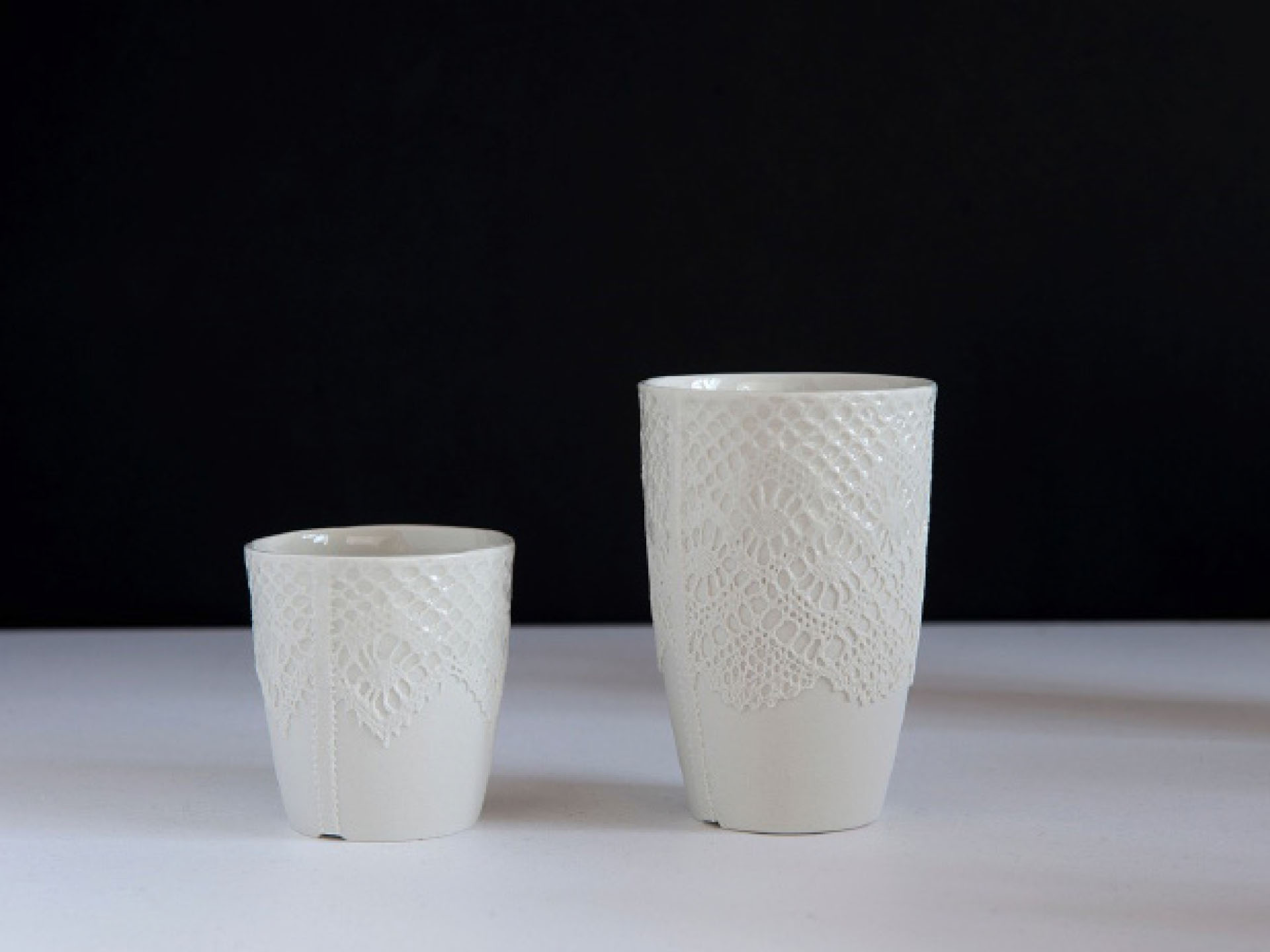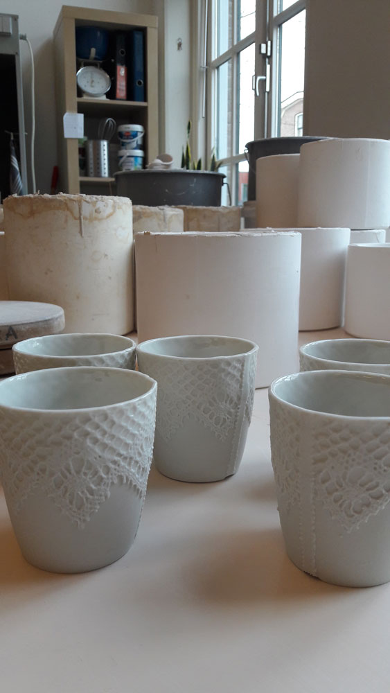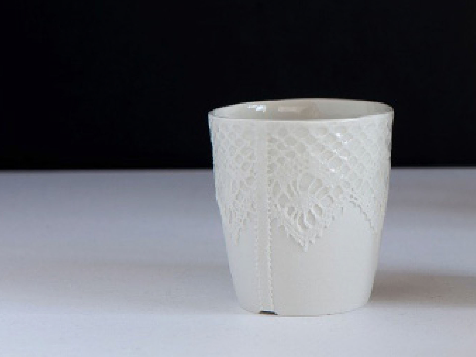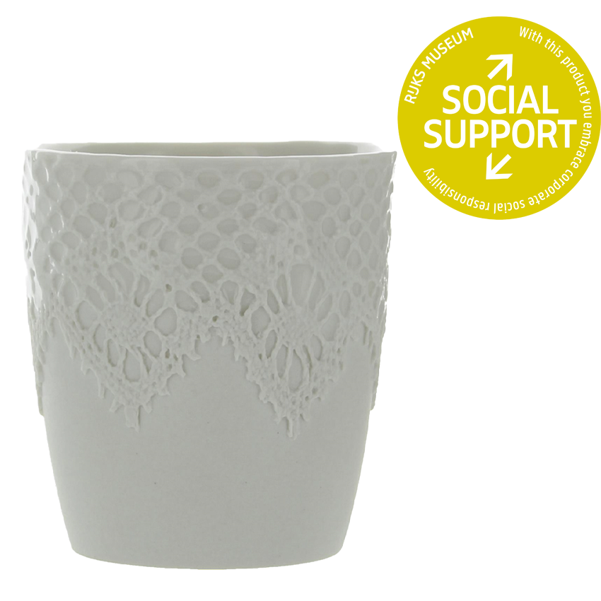 Designer Sander Luske was inspired by the rich lace of Rembrandt's Marten & Oopjen. The pattern of this beautiful lace can be found on this espresso cup made of porcelain. What makes this cup special is that it is handmade by people distanced from the labour market within the Design X Craft project.