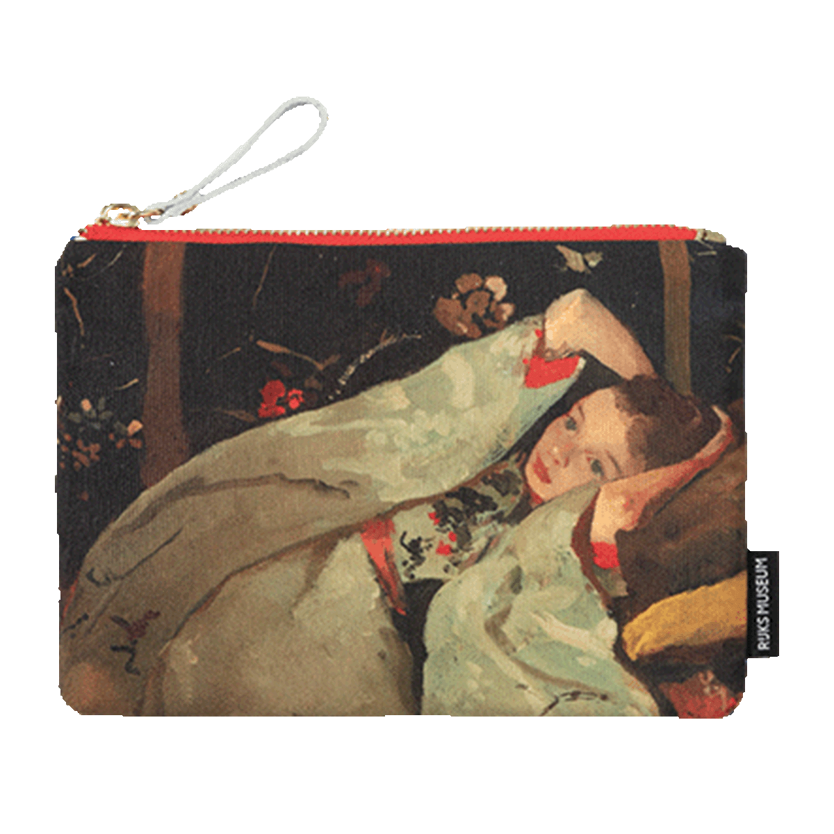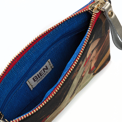 A refined, flat pouch designed in Amsterdam by BIEN moves, inspired by the famous painting Girl in a White Kimono by Breitner. This case features a satin-like cotton front with a detail from the painting, complemented by a back made of blue faux leather. Adorned with a gold-tone zip and a metallic gold leather zip pull for a luxurious finish.