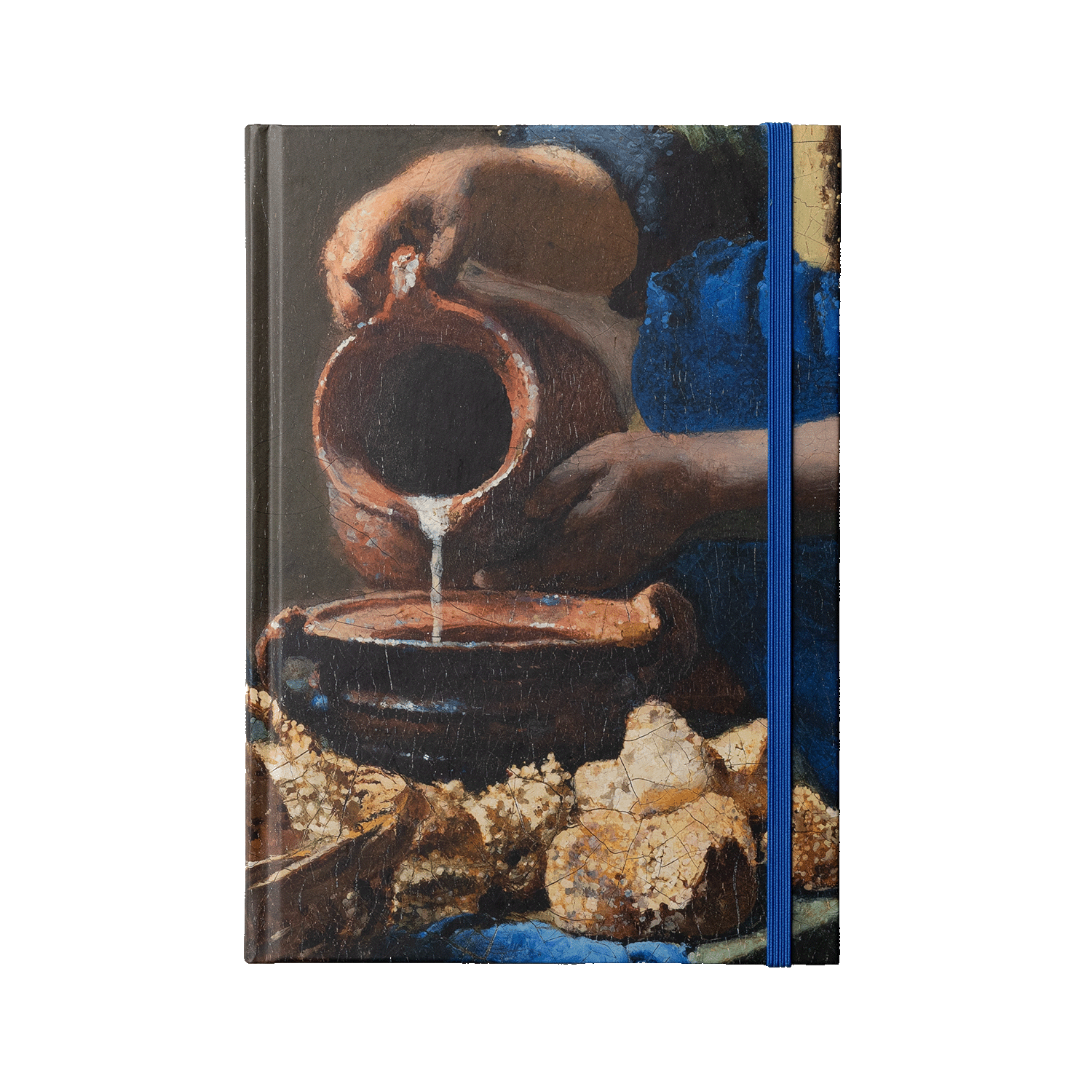 This luxury notebook with hard cover and elastic band, features a print inspired by the work The milkmaid of Johannes Vermeer. The notebook is A5 size with a storage pocket in the back.