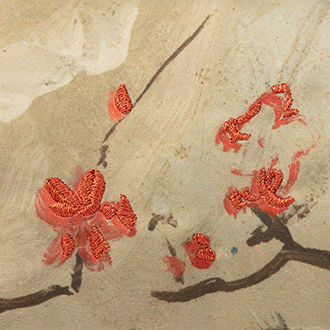• Cover: detail of the artwork on the front with red embroidered flowers, finished with a gold metallic leather zipper pull and a luxurious coral-red ottoman lining.