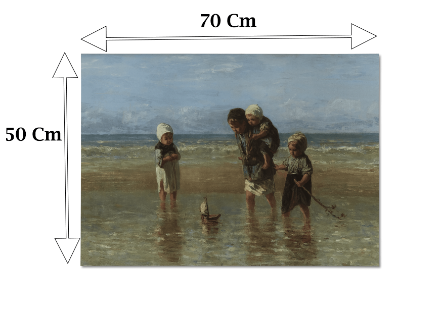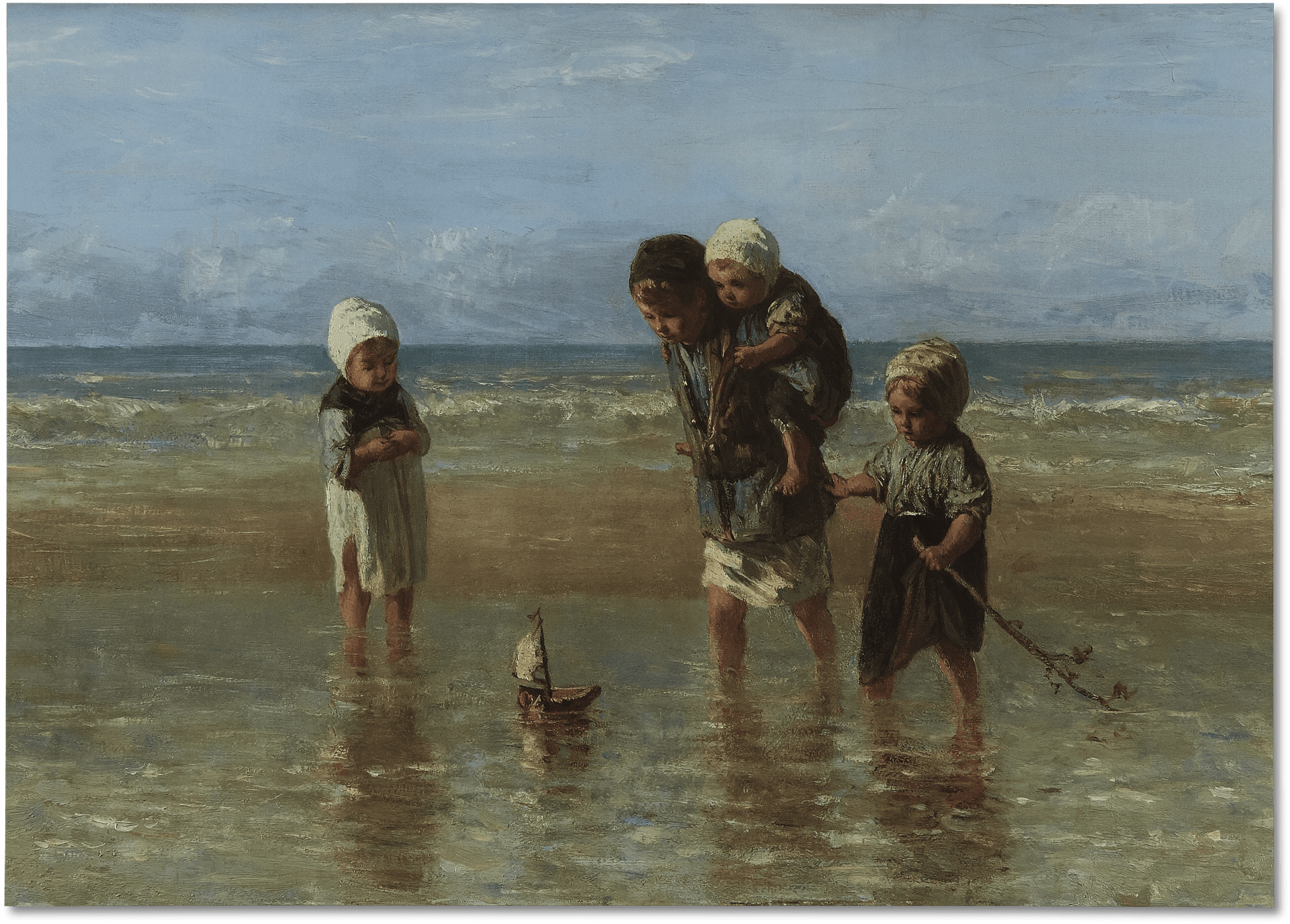 This lovely scene contains a message. The fishermen's children with their shabby clothes and meager toys give us a picture of their future. The oldest boy bears the burden of the family on his shoulders and the boat represents the hard life at sea. Jozef Israels painted this theme for the first time in 1863. It was extremely popular and Israëls has repeated it many times since.
