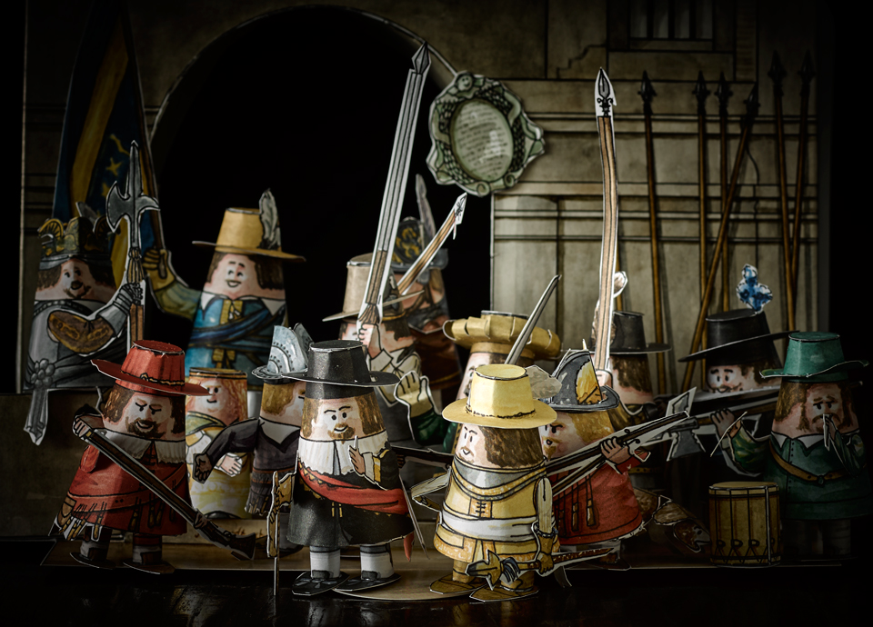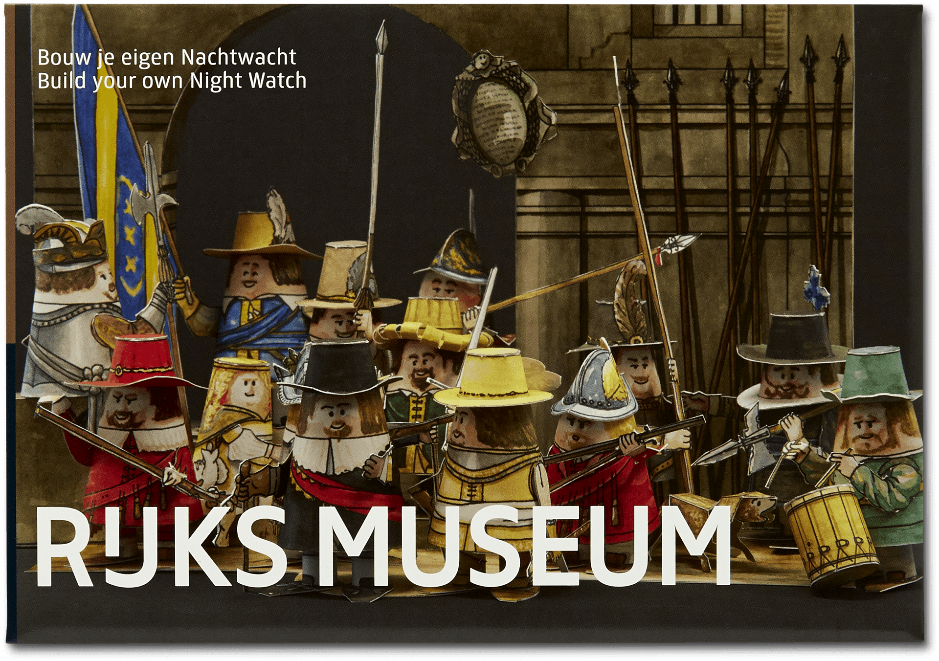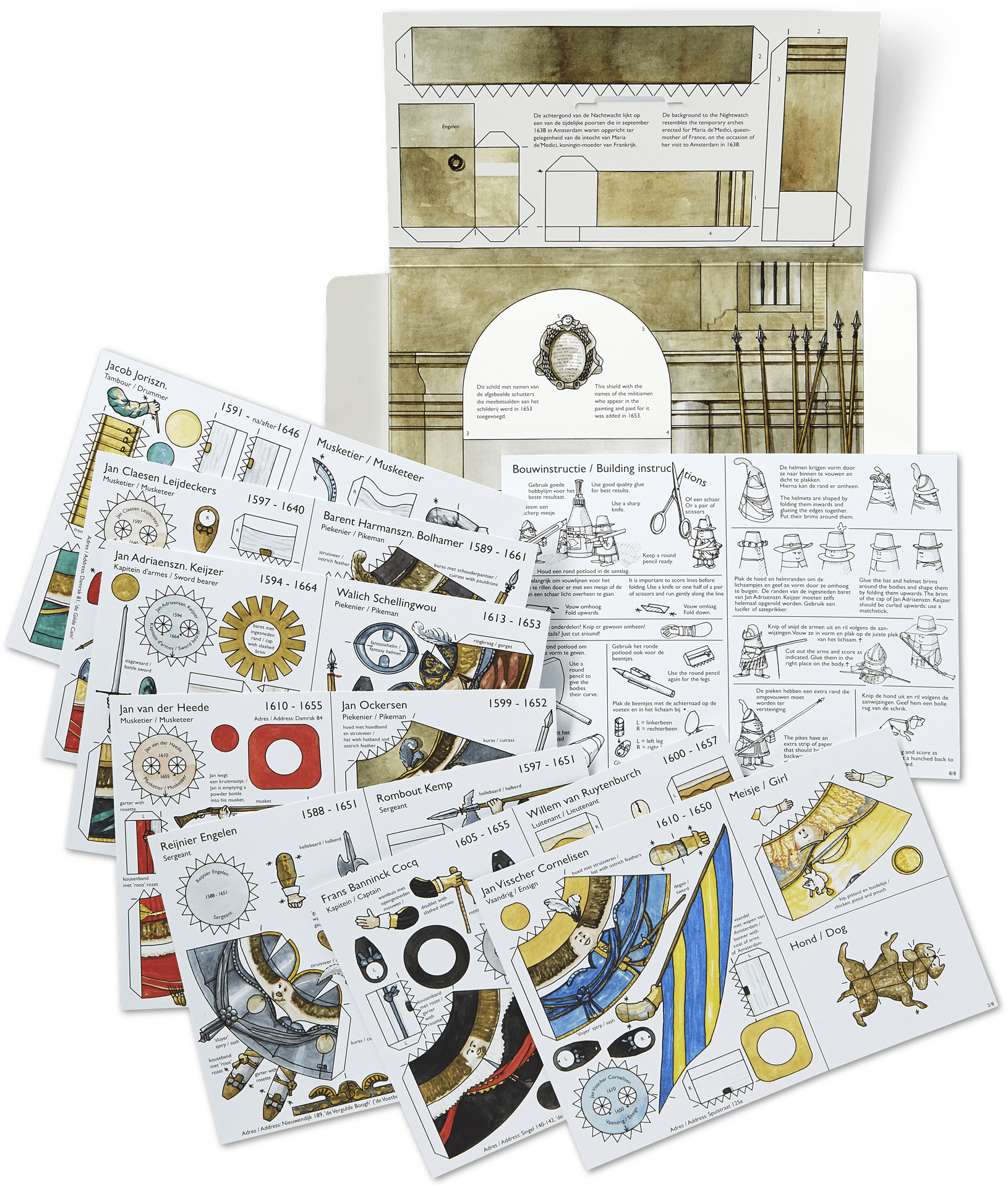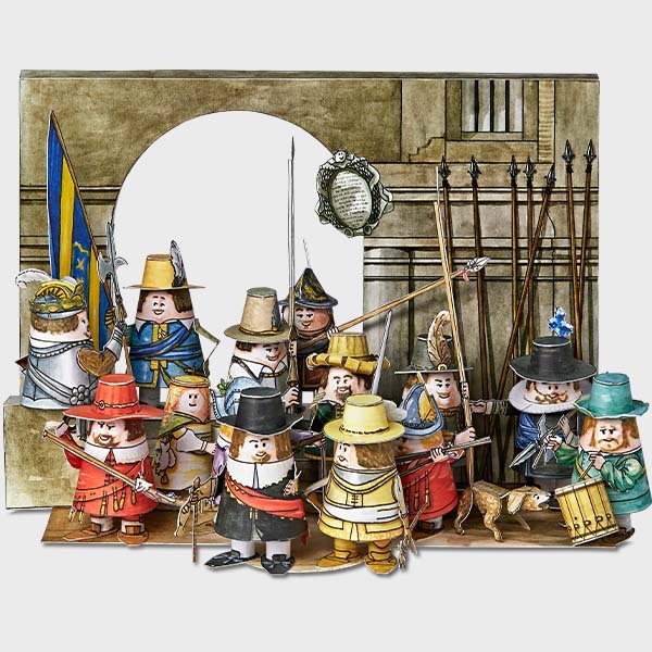 The kit contains construction pictures of 13 archers with weaponry, the girl and the dog from Rembrandt's 'The Night Watch' (1642).