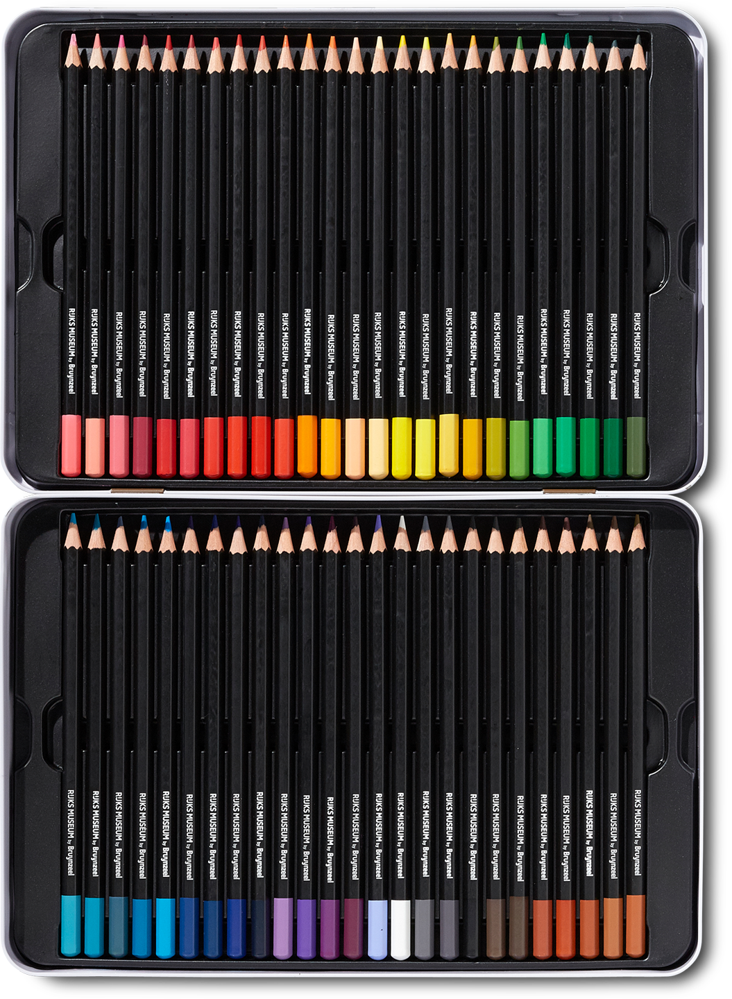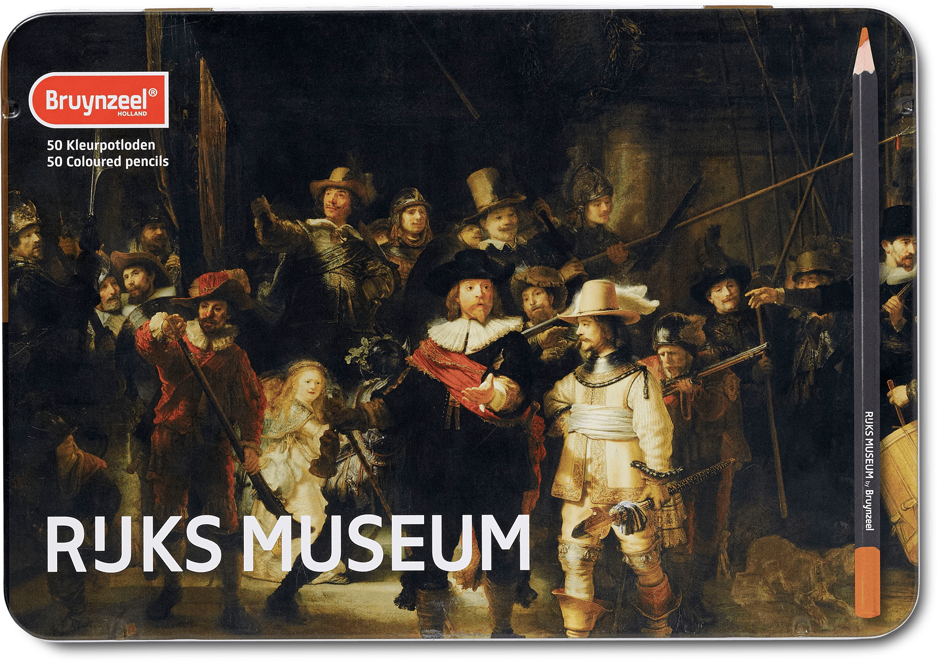 Een set van 50 kleurpotloden in verschillende kleuren, verpakt in een metalen blik met een detail van De Nachtwacht van Rembrandt van Rijn. Gemaakt van hoogwaardige pigmenten. Extra sterke potloden die gemakkelijk te slijpen zijn.