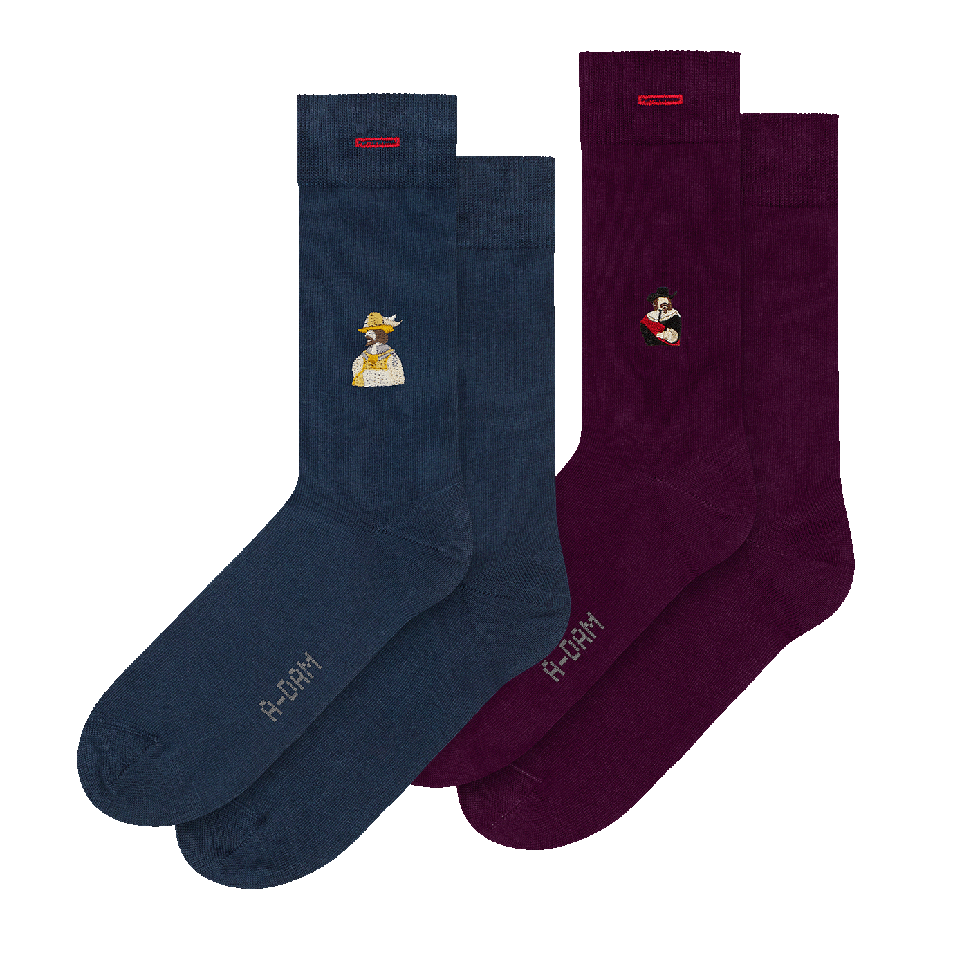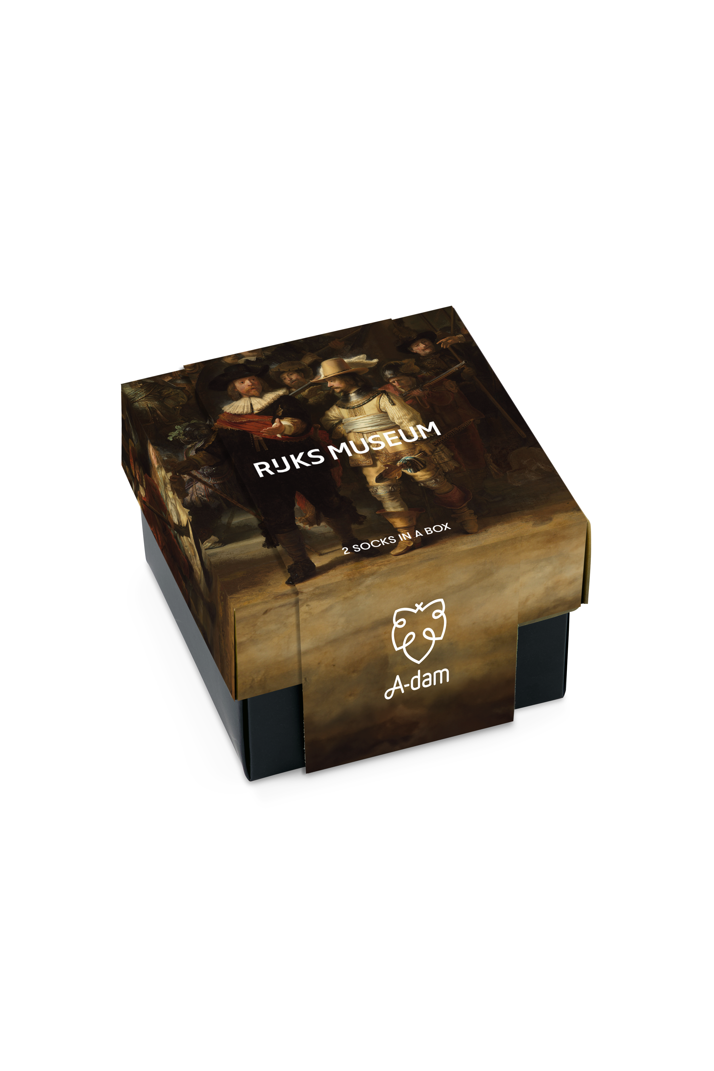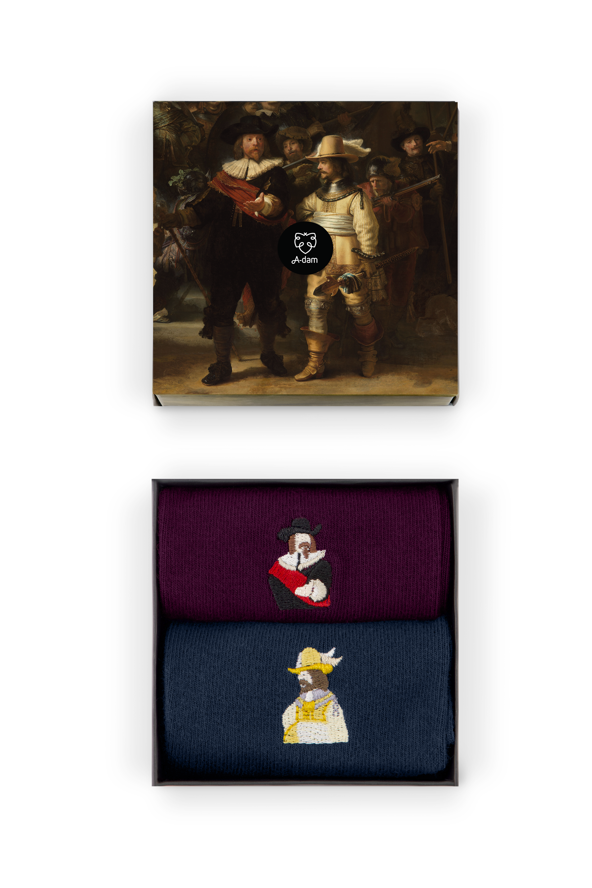 Je kunt De Nachtwacht van Rembrandt niet kopen, maar met deze cadeauset kom je aardig in de buurt. De set bevat twee paar sokken, in de kleuren donkerblauw en burgundy. Leuk om te geven, nog leuker om te krijgen. Exclusief ontworpen voor het Rijksmuseum.