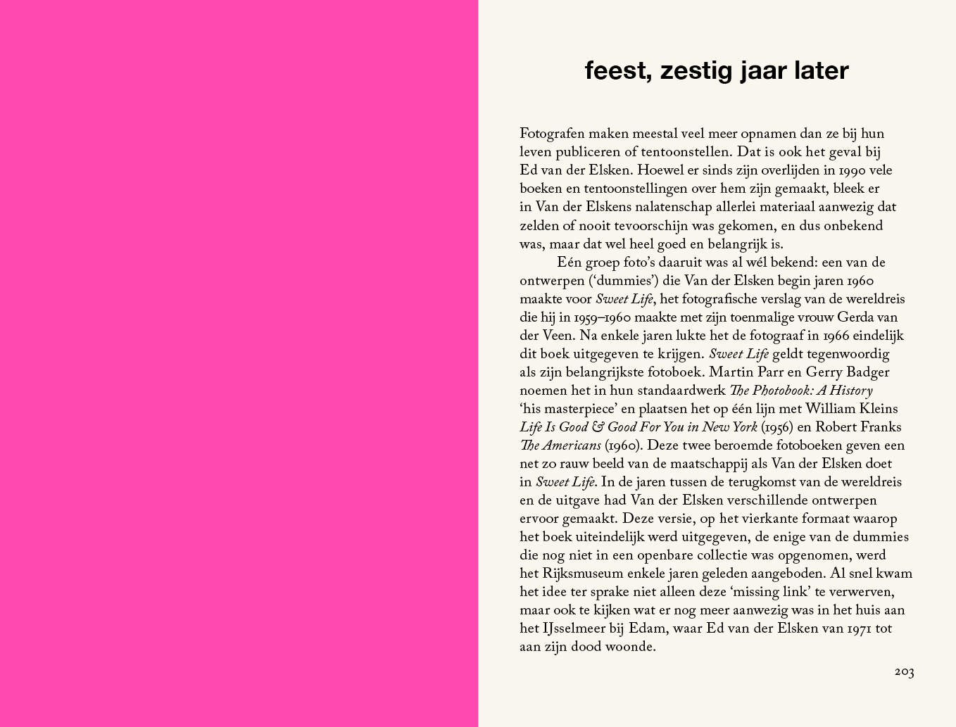 Rond 1960 stelde Ed van der Elsken (1925-1990) een fotoboek samen rond het thema feest. Hij putte uit oud en nieuw werk en maakte een ontwerp dat een aaneenschakeling is van feestelijke gebeurtenissen: plezier, gejuich, dans, muziek, kermis, carnaval, opwinding en extase, maar ook dronkenschap en uitputting in de late uurtjes. Hij combineerde de afzonderlijke foto's tot sprankelende en ritmische paren, waardoor het plezier van de pagina's afspat. Om onbekende redenen is het ontwerp destijds op de plank blijven liggen. Het ontwerp voor feest was een van de grote verrassingen in Van der Elskens nalatenschap die het Rijksmuseum en het Nederlands Fotomuseum in 2019 verwierven. Zestig jaar nadat de fotograaf met schaar en plakband aan het ontwerp werkte, is het levendige boek nu alsnog uitgegeven op het formaat dat hem voor ogen stond.