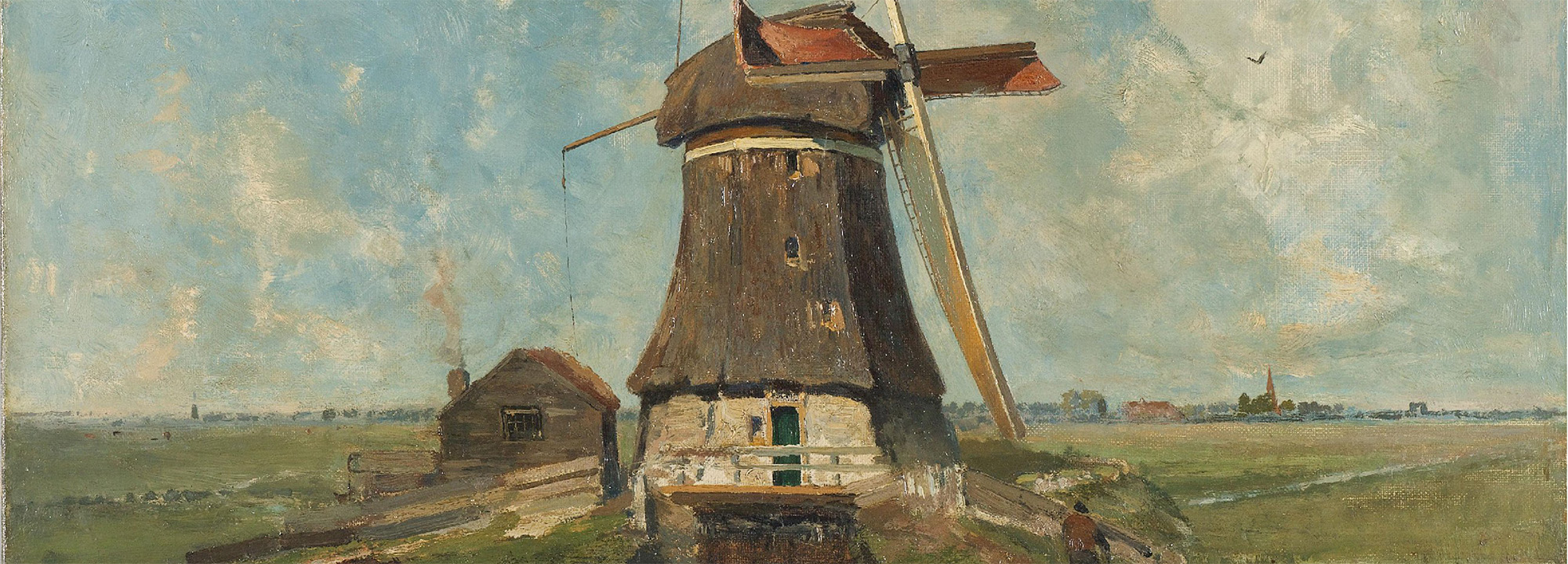 ‘Ons land is gekleurd-sappig-vet. (...) ik herhaal het, ons land is niet grijs, zelfs niet bij grijs weer, de duinen zijn ook niet grijs’, schreef Constant Gabriël in een brief. In tegenstelling tot veel schilders van de Haagse School schilderde hij graag een mooie zomerdag. Op dit schilderij staan er zelfs twee: het gras, de lucht en de molen worden weerspiegeld in het water.