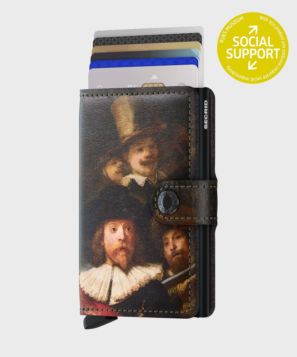 Het Rijksmuseum heeft samen met Secrid de portemonnee van De Nachtwacht gemaakt, geïnspireerd op de collectie van het Rijksmuseum. Compacte portemonnee, maar verrassend groot qua opslagcapaciteit en past in elke broekzak. Het gepatenteerde mechanisme geeft met één simpele beweging toegang tot je kaarten: klaar voor gebruik. De aluminium behuizing beschermt kaarten tegen buigen, breken en ongewenste draadloze communicatie.