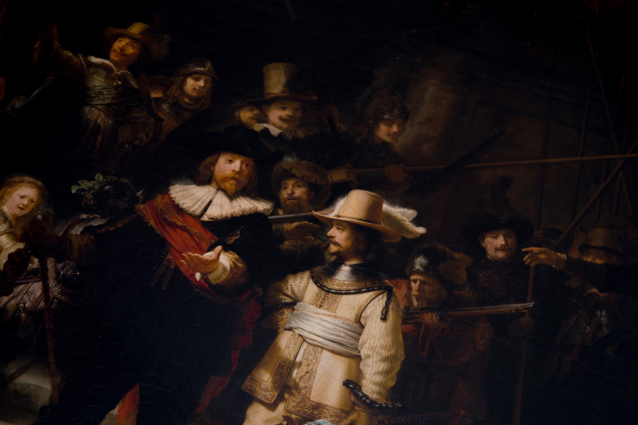 Het grootste en beroemdste werk van Rembrandt is natuurlijk de Nachtwacht, die hij in opdracht maakte voor de schutters van de Kloveniersdoelen. Dit was een van de verenigingsgebouwen van de Amsterdamse schutterij, de burgerwacht van de stad. Rembrandt was de eerste die op een groepsportret de figuren in actie weergaf. Mascotte van de schutters De kapitein, in het zwart, geeft zijn luitenant opdracht dat de compagnie moet gaan marcheren. De schutters stellen zich op. Wat de Nachtwacht met name zo beroemd maakt is de wijze waarop Rembrandt licht heeft gebruikt in het schilderij. Zo legde hij de aandacht op belangrijke details, zoals de schaduw van het handgebaar van de kapitein die het stadswapen van Amsterdam op de goudgele jas van de man naast hem 'beschermd '. Ook het kleine meisje op de achtergrond valt door het licht extra op. Zij is de mascotte van de schutters.