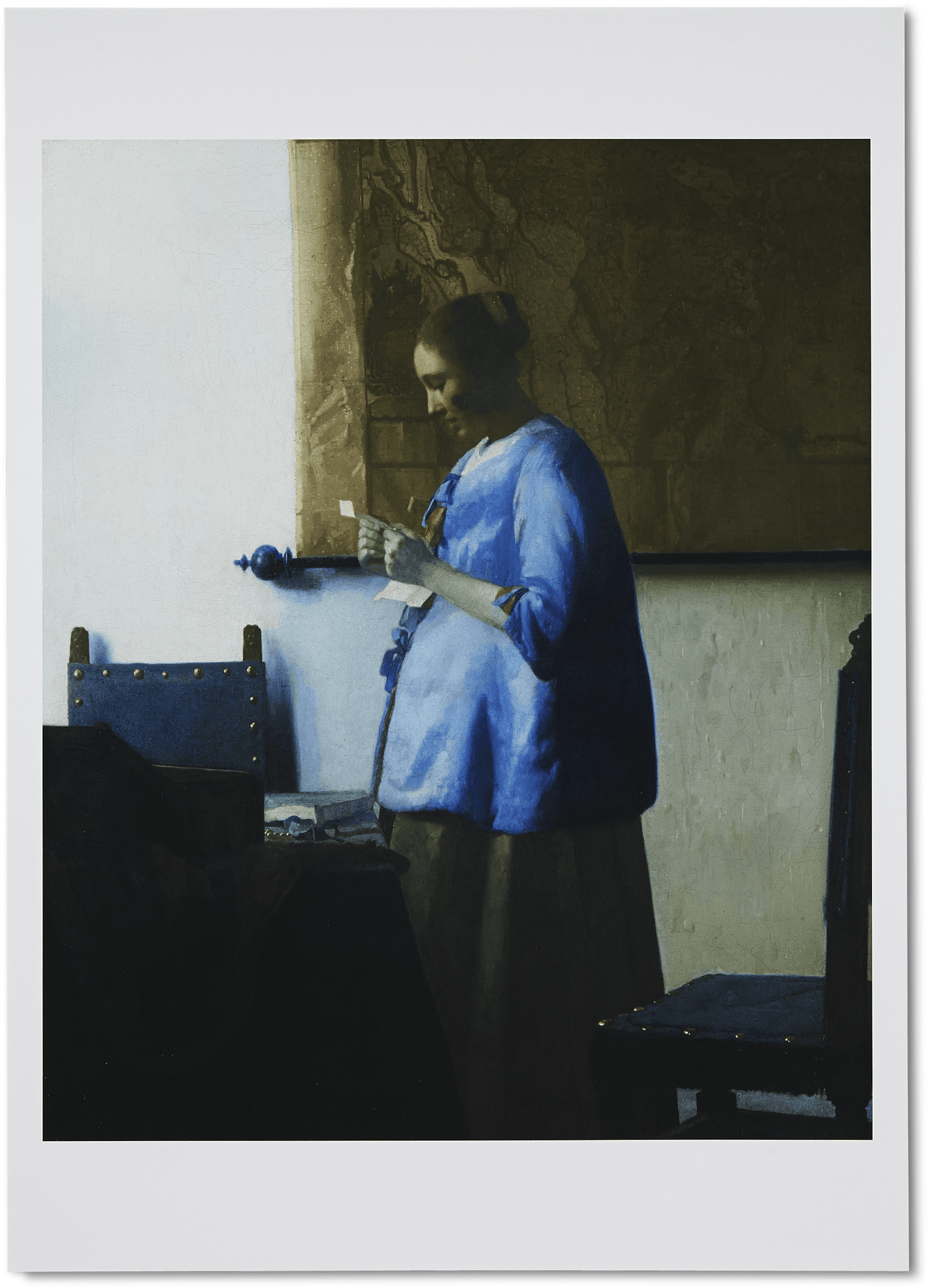 Haarscherpe en kleurechte poster van Brieflezende vrouw van Johannes Vermeer. Voor deze reproductie is een digitale foto van het originele schilderij gebruikt die voldoet aan de strenge richtlijnen van het nationale Metamorfoze-programma.