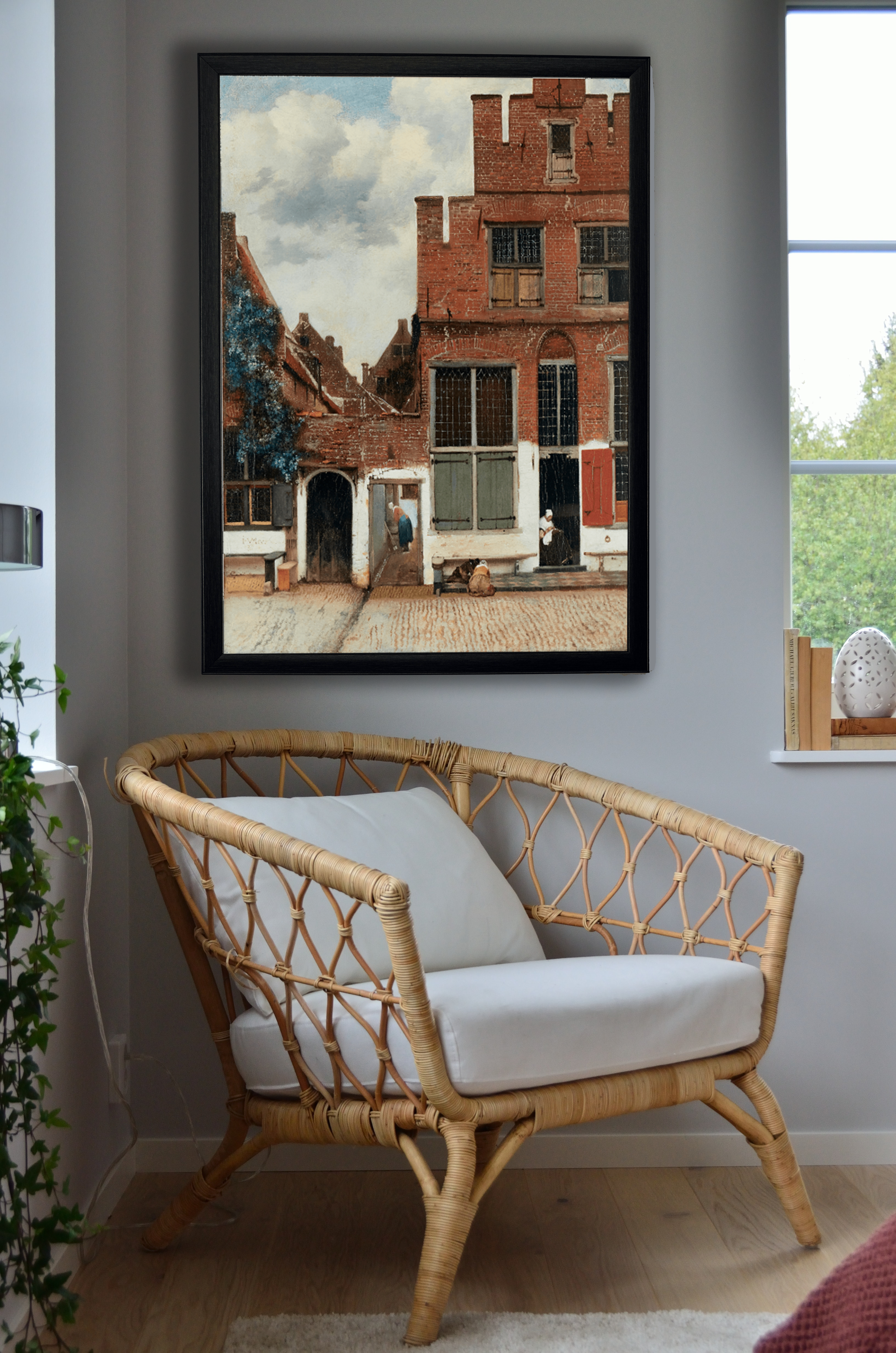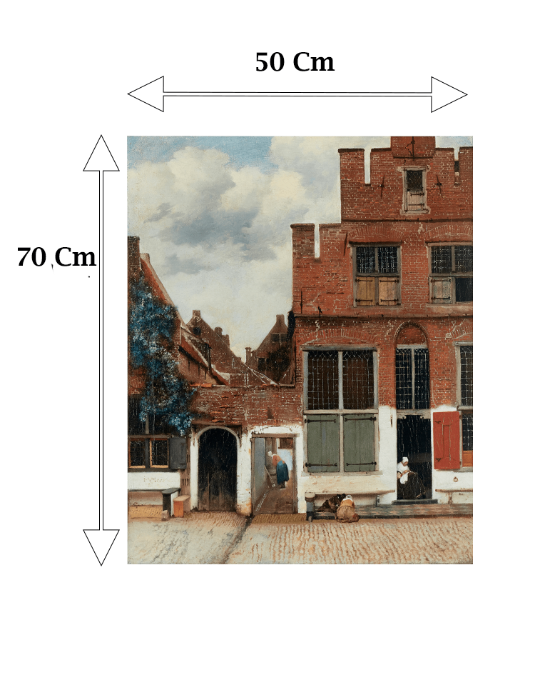 Een ongewoon schilderij in het oeuvre van Vermeer: een rustig straatje met huizen en een paar mensen. Rechte hoeken bepalen de evenwichtige compositie; de driehoek van de hemel voegt spanning toe. De oude muren, grove bakstenen en het witte pleisterwerk zijn bijna tastbaar. Toch heeft Vermeer zich ook vrijheden gepermitteerd, zoals de te grote groene vensterluiken.