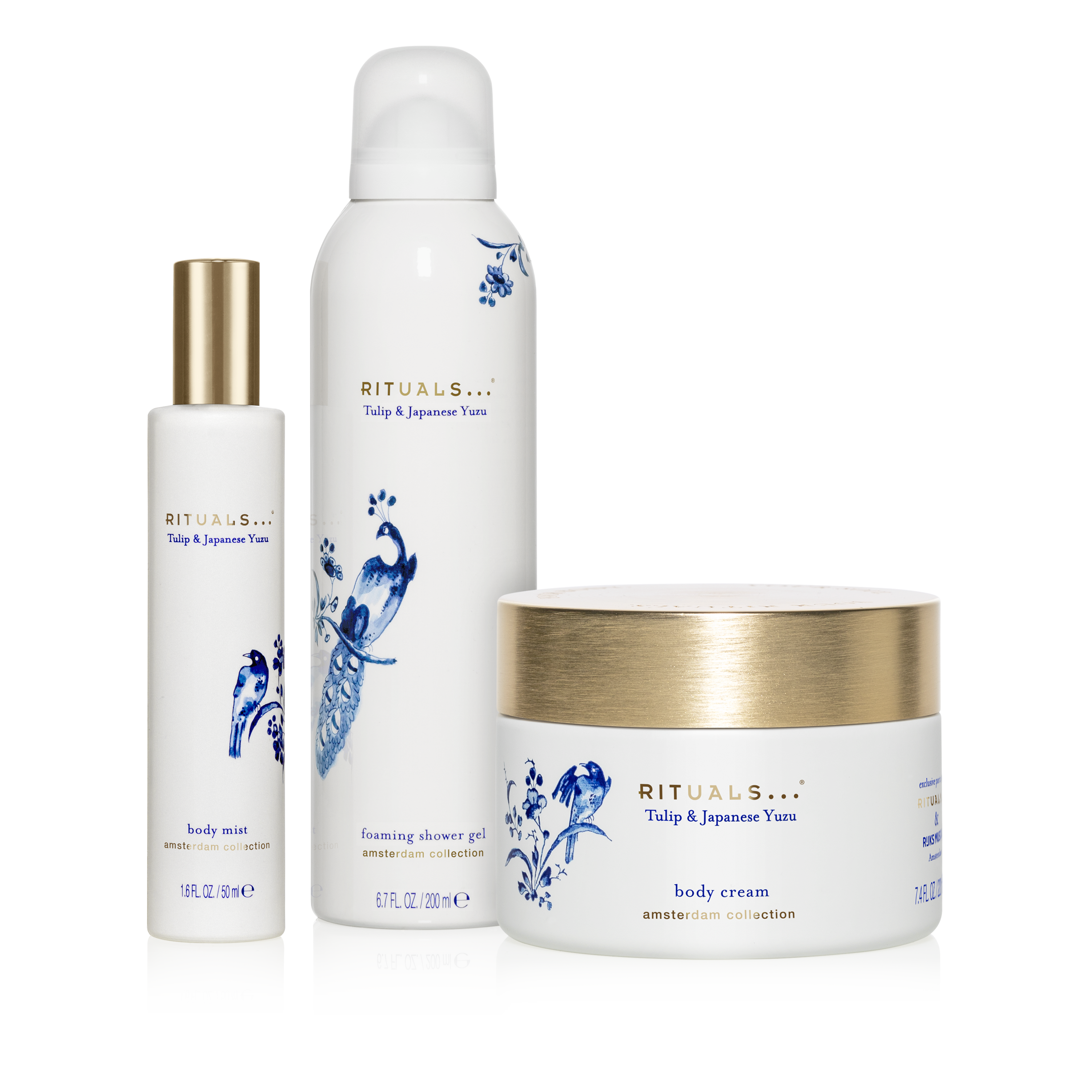De samenwerking tussen Rituals en het Rijksmuseum leidde tot de creatie van de Amsterdam Collection, een buitengewone collectie waarin het parfum van Nederlandse tulpen en Japanse yuzu centraal staat: geurende symbolen uit de periode dat Amsterdam en de schoonheid van het oude Azië elkaar vonden in een nieuwe tijd. Het ontwerp is gebaseerd op een iconische Delfts Blauwe vaas, met prachtige illustraties van de Aziatische invloeden op de veranderingen van de Nederlandse leefstijl, kunst en decoraties tijdens de Gouden Eeuw. Elk product is speciaal ontworpen om een gevoel van totale ontspanning, welzijn en luxe op te roepen. Omring jezelf met de onvergetelijke en sensuele rijkdom van geurende bloemen en exotische specerijen.