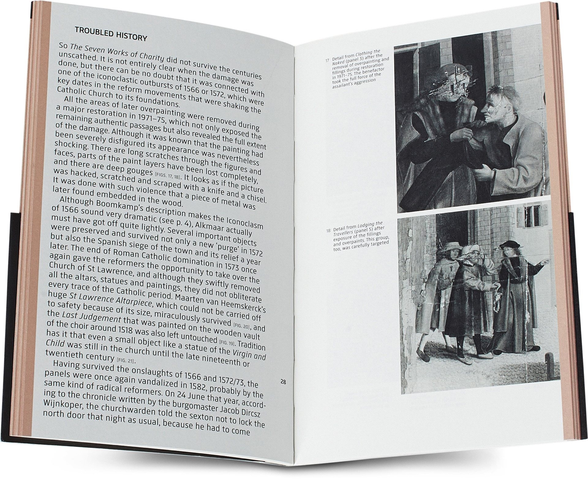 Lange krassen door figuren en gezichten, diepe kloven, verdwenen verflagen − dat was het lot van zeven panelen met de werken van barmhartigheid in Alkmaar. De beschadigingen werden hoogstwaarschijnlijk aangebracht tijdens verschillende beeldenstormen in de 16de eeuw. Vandalen hakten met een mes en beitel ongemeen ruw in op de voorstellingen en schraapten hele passages weg. Het mag een wonder heten dat de schilderijenreeks de aanvallen sowieso heeft overleefd. Met grote vaardigheid en veel aandacht voor details en licht- en schaduwwerking heeft de nu anonieme schilder de zeven goede daden verbeeld die een gelovige dient te verrichten jegens zijn minder bedeelde medemens. Het uitzonderlijke perspectief en de enigszins hoekige figuren geven de tafereeltjes een bijzondere, eigenwijze charme. In deze uitgave in de Rijksmuseum Reeks vertelt auteur Matthias Ubl meer over deze zogeheten Meester van Alkmaar en natuurlijk over diens hoofdwerk uit 1504, dat al meer dan vijfhonderd jaar bewaard is gebleven − met zijn originele omlijsting.